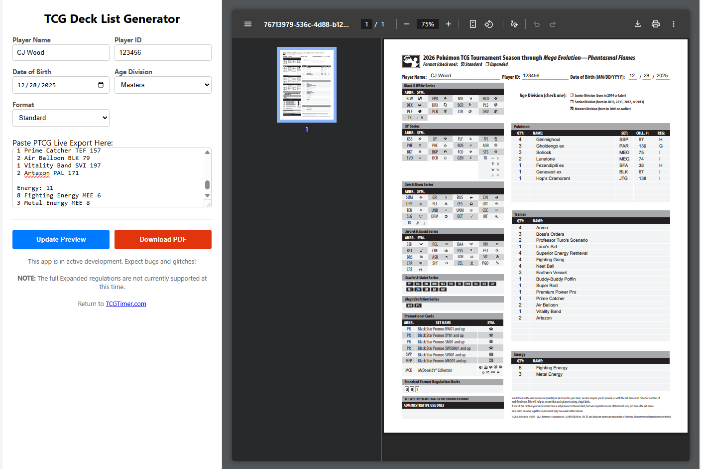 An online deck list generator based on the official Play! Pokemon template. Simply export your deck list from PTCG Live or Limitless, paste it in the generator, and download the filled PDF!